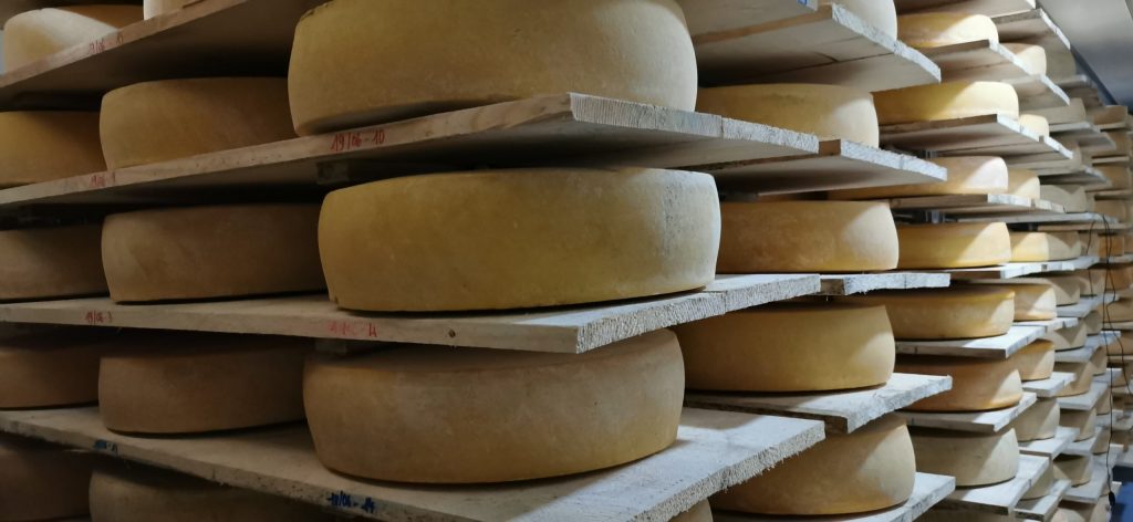 Le lait frais, issu de la traite des vaches, est directement envoyé dans le tank de la fromagerie pour être transformé en différents types de fromages. Nous avons construit une cave d’affinage à côté de l’atelier, où les meules maturent pendant plusieurs semaines, mois ou années.